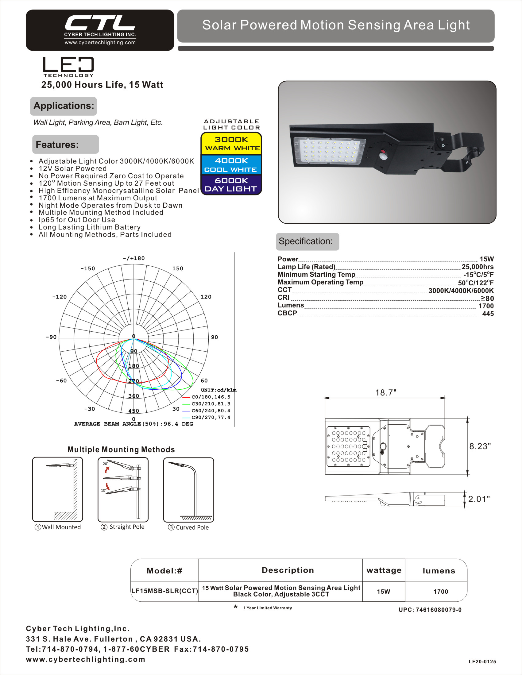 | LF15MSBSLRCCT | 15W Solar Motion Sensor Area Light, Adj. 3CCT 3K, 4K, 6K | |  |